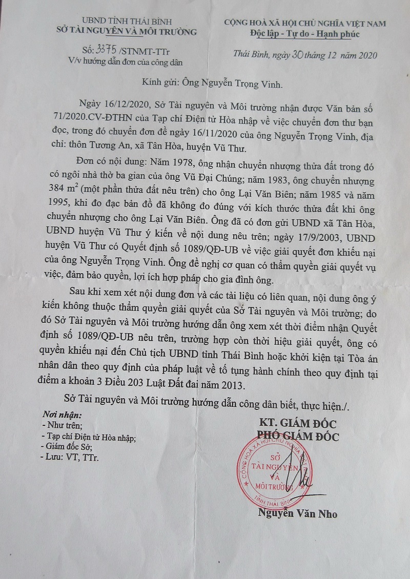 Văn bản số 3375/STNMT-TTr có nội dung như sau: “Ngày 16/12/2020, Sở Tài nguyên và Môi trường nhận được văn bản số 71/2020.CV - ĐTHN của Tạp chí Điện tử Hòa nhập về việc chuyển đơn thư bạn đọc, trong đó chuyển đơn đề ngày 16/11/2020 của ông Nguyễn Trọng Vinh, địa chỉ: Thôn Tương An, xã Tân Hòa, huyện Vũ Thư.