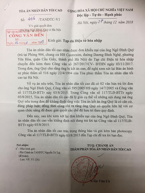 Nội dung Công văn số 466/TANDTC-V1 có đoạn ghi: “Tòa án nhân dân tối cao nhận được đơn khiếu nại của ông Ngô Đình Quý (trú tại Phòng 904, chung cư HH Contrexim, đường Dương Đình Nghệ, phường Yên Hòa, quận Cầu Giấy, thành phố Hà Nội) do Tạp chí Điện tử Hòa Nhập chuyển đến kèm theo Công văn số 267/2017/CV – ĐTHN ngày 03/11/2017. Trong đơn, ông Quý cho rằng ông bị kết án oan, đề nghị xem xét lại Bản án hình sự phúc thẩm số 516 ngày 22/4/1994 của Tòa phúc thẩm Tòa án nhân dân tối cao tại Hà Nội.
