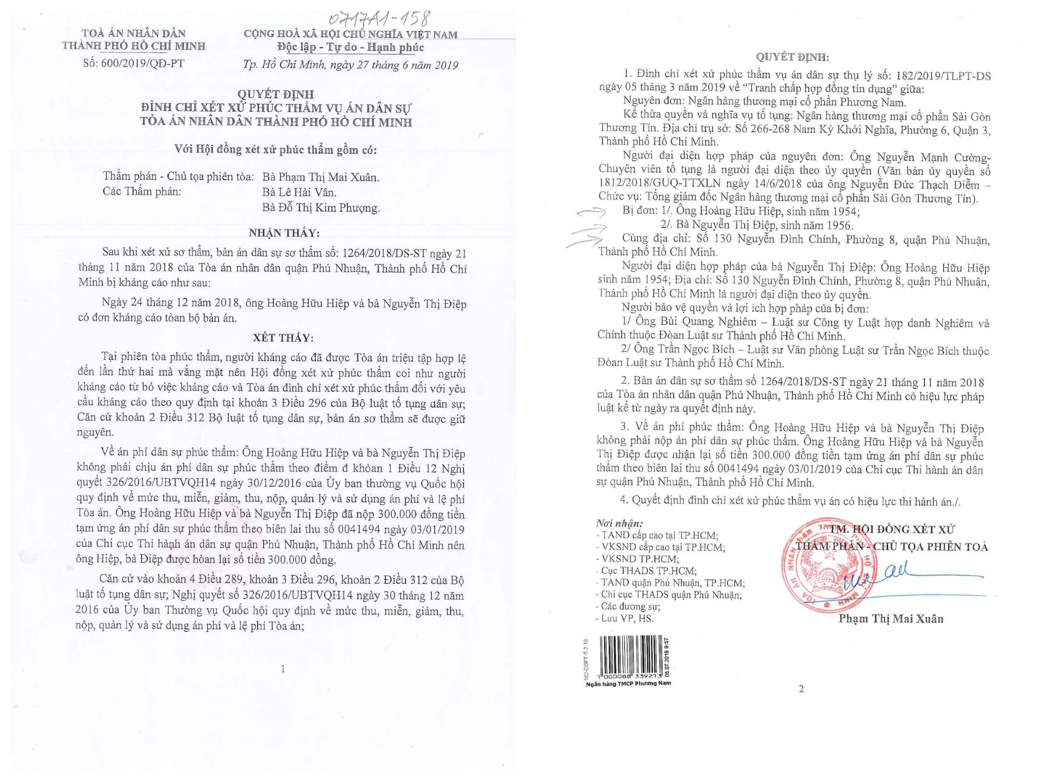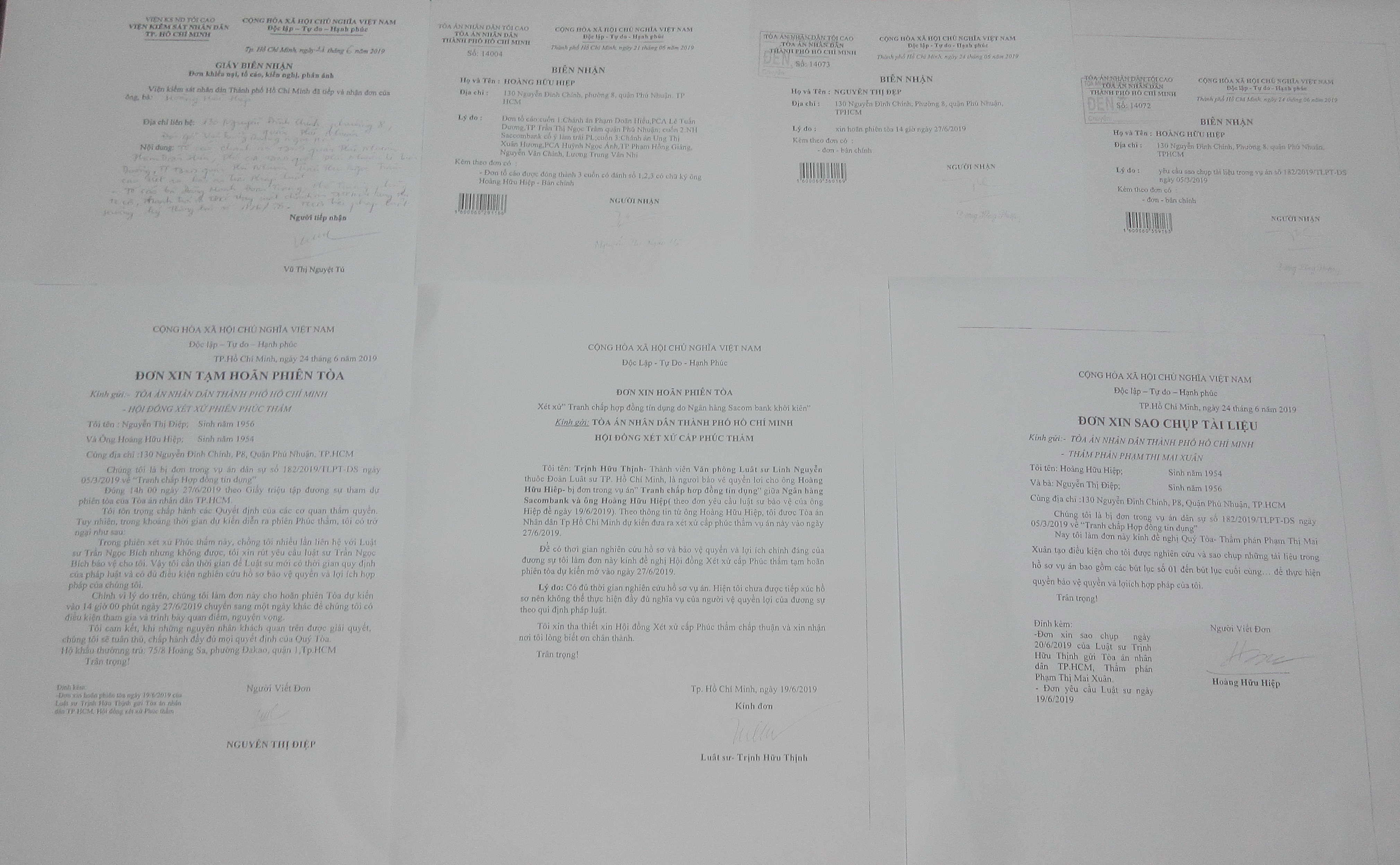 Ngày 24/6/2019, Bà Nguyễn Thị Điệp có đơn xin tạm hoãn phiên tòa phúc thẩm gửi Tòa án nhân dân Thành phố Hồ Chí Minh, Hội đồng xét xử phiên phúc thẩm có nội dung như sau: “Trong phiên tòa xét xử phúc thẩm ngày 27/6/2019 theo giấy triệu tập đương sự tham dự phiên tòa, tôi có trở ngại như sau: Ông Hoàng Hữu Hiệp nhiều lần liên hệ với Luật sư Trần Ngọc Bích không được, tòa mời Luật sư Trần Ngọc Bích cũng vắng mặt. Vì vậy, tôi xin rút yêu cầu Luật sư Trần Ngọc Bích bảo vệ và cần có thời gian để có Luật sư mới nghiên cứu hồ sơ để bảo vệ quyền lợi ích hợp pháp của chúng tôi. Chính vì lý do trên tôi có đơn Hoãn phiên Tòa phúc thẩm dự kiến vào lúc 14 giờ 00 phút ngày 27/6/2019 chuyển sang một ngày khác để chúng tôi có điều kiện tham gia và trình bày quan điểm, nguyện vọng” đồng thời đính kèm đơn hoãn phiên tòa ngày 19/6/2019 của Luật sư Trịnh Hữu Thịnh gửi Tòa án nhân dân Thành phố Hồ Chí Minh, Hội đồng xét xử phúc thẩm. Tòa án nhân dân Thành phố Hồ Chí Minh đã nhận đơn và có biên nhận số 14073 ngày 24/6/2019.