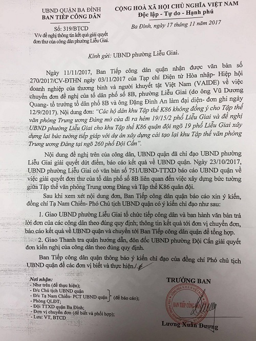 Nội dung Công văn số 319/BTCD có đoạn ghi: “Ngày 11/11/2017, Ban Tiếp công dân quận nhận được văn bản số 270/2017/CV-ĐTHN ngày 03/11/2017 của Tạp chí điện tử Hòa nhập - Hiệp hội doanh nghiệp của thương binh và người khuyết tật Việt Nam (VAIDE) về việc chuyển đơn đề nghị của tổ dân phố 8B, phường Liễu Giai (do ông Vũ Dương Quang - Tổ trưởng tổ dân phố 8B và ông Đặng Đình An làm đại diện - đơn ghi ngày 12/9/2017). Nội dung đơn: “Các hộ dân khu tập thể K86 không đồng ý cho Tập thể văn phòng Trung ương Đảng mở cửa đi ra hẻm 19/15/2 phố Liễu Giai và đề nghị UBND phường Liễu Giai cho khu Tập thể K86 quân đội ngõ 19 phố Liễu Giai xây dựng lại bức tường tiếp giáp với dự án xây dựng cải tạo lại khu Tập thể văn phòng Trung ương Đảng tại ngõ 260 phố Đội Cấn”.