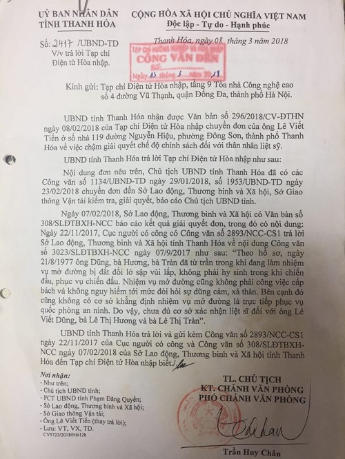 Nội dung Công văn số 2417/UBND-TD có đoạn ghi: UBND tỉnh Thanh Hóa nhận được Văn bản số 296/2018/CV-ĐTHN ngày 08/02/2018 của Tạp chí Điện tử Hòa nhập chuyển đơn của ông Lê Viết Tiến ở số nhà 119 đường Nguyễn Hiệu, phường Đông Sơn, thành phố Thanh Hóa, tỉnh Thanh Hóa về việc chậm giải quyết chế độ chính sách đối với thân nhân liệt sỹ.
