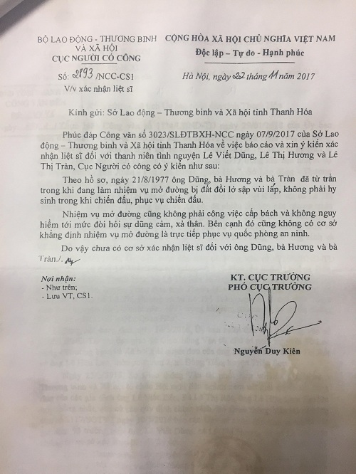 Ngày 07/02/2018, Sở Lao động, Thương binh và Xã hội có Văn bản số 308/SLĐTBXH-NCC báo cáo kết quả giải quyết đơn, trong đó có nội dung: Ngày 22/11/2017, Cục người có công có Công văn số 2893/NCC-CS1 trả lời Sở Lao động, Thương binh và Xã hội tỉnh Thanh Hóa về nội dung Công văn số 3023/ SLĐTBXH-NCC ngày 07/09/2017 như sau: “Theo hồ sơ, ngày 21/8/1977 ông Dũng, bà Hương, bà Tràn đã từ trần trong khi đang làm nhiệm vụ mở đường bị đất đồi lở sập vùi lấp, không phải hy sinh trong khi chiến đấu, phục vụ chiến đấu. Nhiệm vụ mở đường cũng không phải công việc cấp bách và không nguy hiểm tới mức đòi hỏi sự dũng cảm, xả thân. Bên cạnh đó cũng không có cơ sở khẳng định nhiệm vụ mở đường là trực tiếp phục vụ quốc phòng an ninh. Do vậy, chưa đủ cơ sở xác nhận liệt sĩ đối với ông Lê Viết Dũng, bà Lê Thị Hương và bà Lê Thị Tràn".