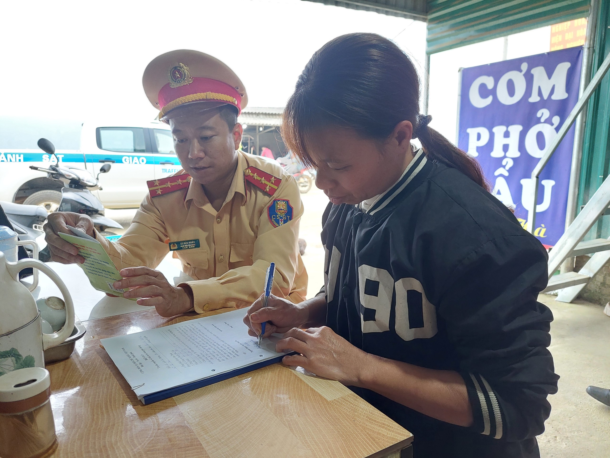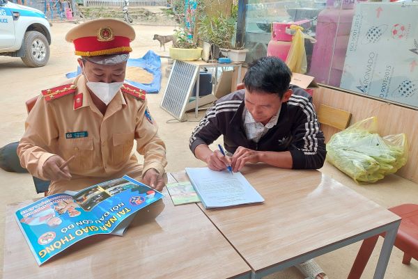 Cán bộ đội CSGT - TT Công an huyện Bắc Yên tuyên truyền và cho chủ các quán nhậu ký cam kết không để khách hàng đã uống rượu bia nhưng vẫn cố tình điều khiển phương tiện tham gia giao thông.