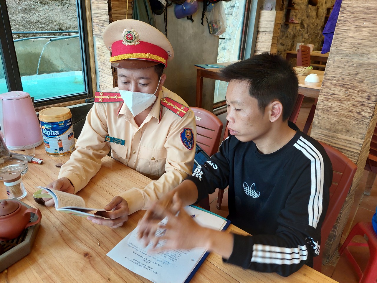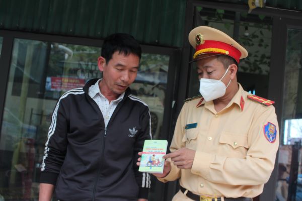 Đội CSGT - TT Công an huyện Bắc Yên tặng các nhà hàng cuốn cẩm nang phòng chống tai nạn xe máy.
