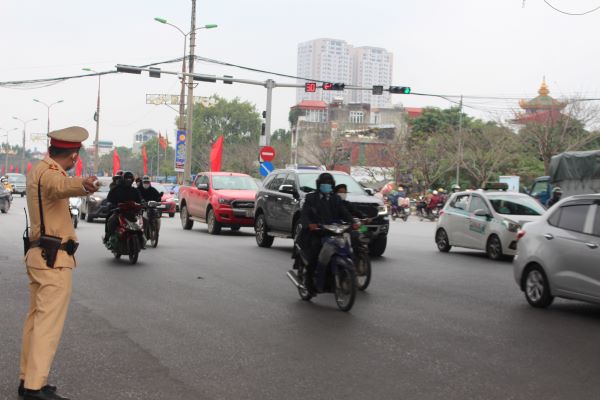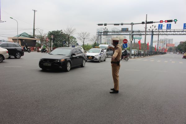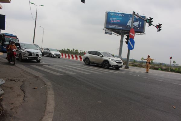 Đội CSGT số 15 (Phòng CSGT Công an TP Hà Nội) đảm bảo trật tự an toàn giao thông phân luồng chống ùn tắc tại ngã tư Võ Văn Kiệt - Quốc lộ 2 (hướng từ Hà Nội đi Sân bay Nội Bài).