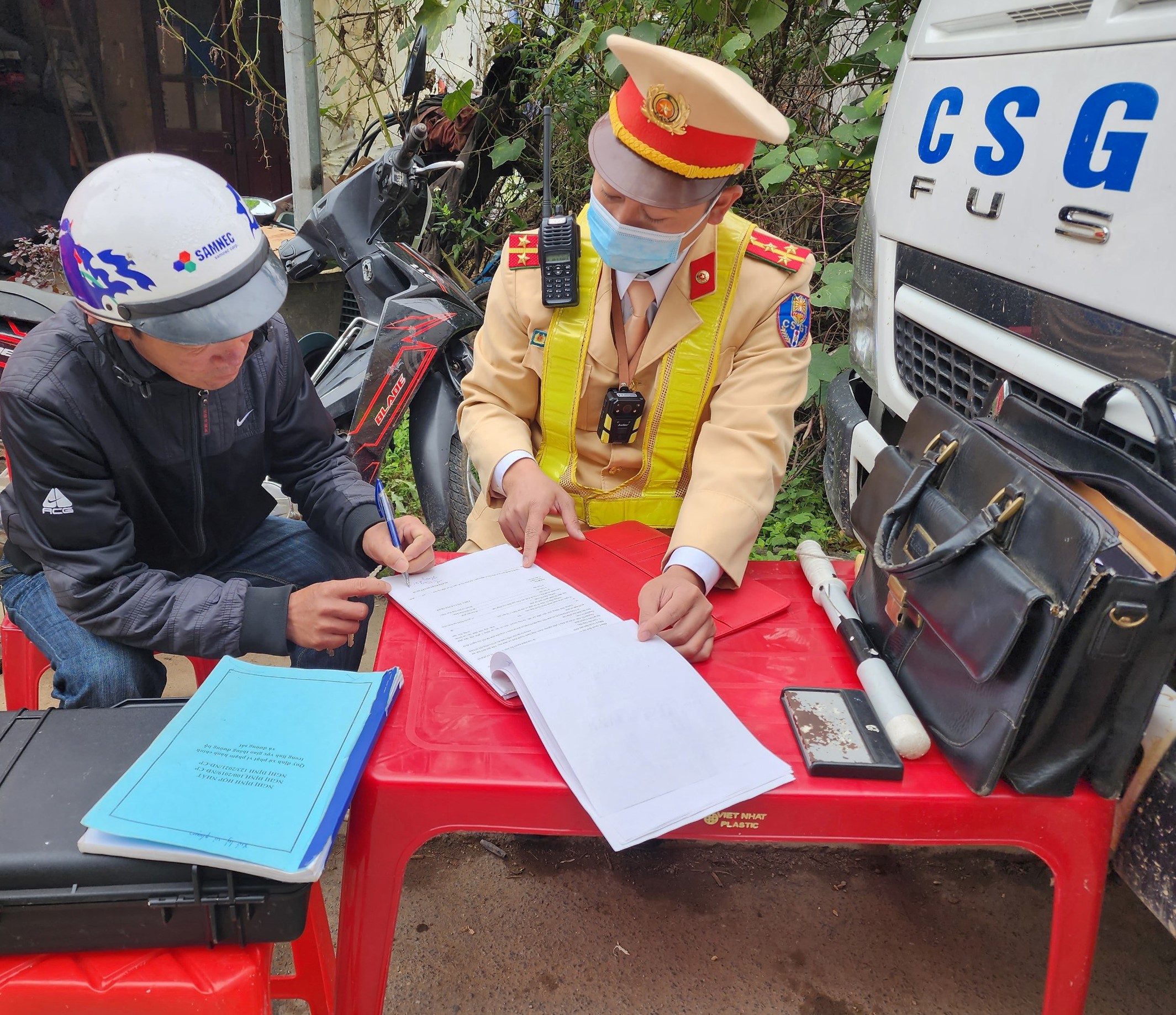 Tổ công tác Đội CSGT - TT Công an huyện Đồng Văn lập biên bản và yêu cầu tài xế kí vào biên bản vi phạm nông độ cồn.