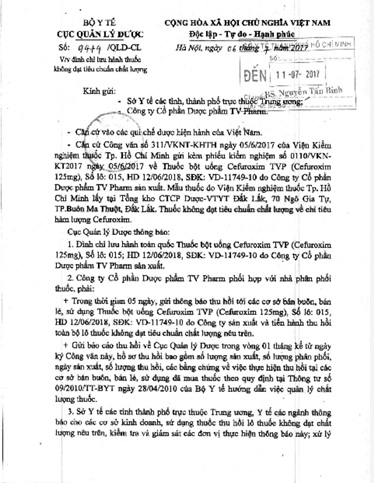 Cục quản lý Dược có CV số 9479/QLD-CL V/v đình chỉ lưu hành thuốc không đạt tiêu chuẩn chất lượng, với thuốc bột uống Cefuroxim TVP, số lô: 015, do Cty CP dược phẩm TV Pharm sản xuất.