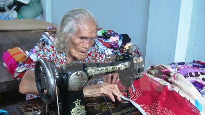 | Cụ Màng cắt vải vụn để may chăn tặng người nghèo. (Ảnh: Thanh Tân/TTXVN) |