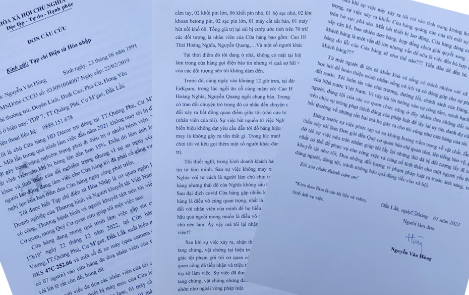 Đứng trước sự việc phức tạp và sự khủng hoảng trầm trọng về vật chất, lẫn tinh thần này tôi làm Đơn gửi đến Quý cơ quan báo chí quan tâm, lên tiếng bảo vệ, giúp đỡ tôi sự việc nêu trên nhằm giúp tôi lấy lại những thứ đã bị đối tượng lấy đi sớm nhất có thể để phục vụ cho công việc và củng cố tinh thần cho một người yếu thế, khuyết tật như tôi; Đưa những đối tượng vi phạm pháp luật ra trước ánh sáng, xử đúng người, đúng tội, tránh những hậu quả đáng tiếc cho xã hội.”