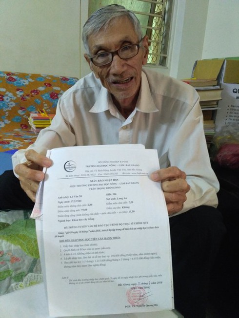 | Ông Lê Văn Xê với tấm giấy báo nhập học lớp cao học chuyên ngành Khoa học cây trồng. |