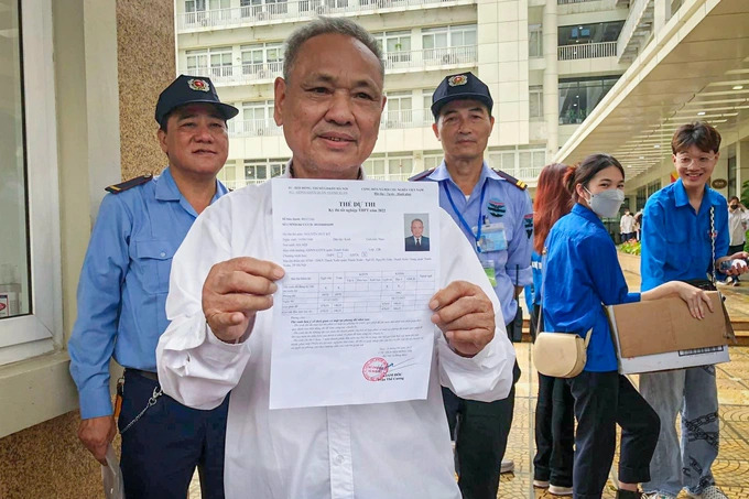 Cụ Kỳ khoe thẻ dự thi tại điểm thi Trường THCS Thanh Xuân (quận Thanh Xuân, Hà Nội). (Ảnh: Minh Thư)