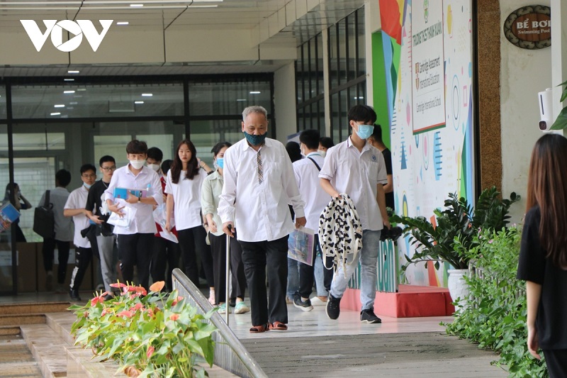 Cụ Huy Kỳ chống gậy đi thi tốt nghiệp ngày 8/7 vừa qua. (Ảnh: VOV)