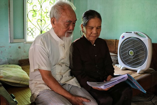 | Lúc rảnh rỗi, cụ Thiêm và cụ Sinh thường xuyên đọc sách báo cho nhau nghe. Ảnh: Thái Hà. |