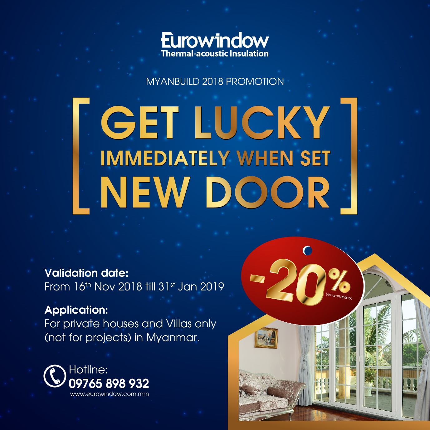 Nhân dịp này, từ ngày 16/11/2018 đến hết ngày 31/01/2019, Eurowindow sẽ triển khai chương trình ưu đãi, khuyến mãi giảm 20% giá trị thanh toán (trước VAT) đối với tất cả các khách hàng ký hợp đồng mua và lắp đặt sản phẩm cho công trình nhà riêng. Đây là cơ hội tốt để khách hàng Myanmar được sử dụng và trải nghiệm sản phẩm cao cấp Eurowindow mà vẫn tiết kiệm được chi phí