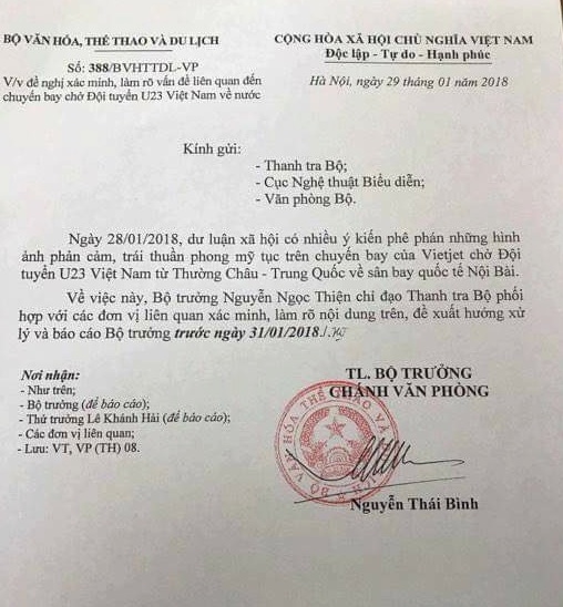 Ngày 29/1, Bộ Văn hóa Thể thao và Du lịch có công văn truyền đạt chỉ đạo của Bộ trưởng Nguyễn Ngọc Thiện về việc xác minh hình ảnh phản cảm trên chuyến bay chở đội tuyển U23 Việt Nam.