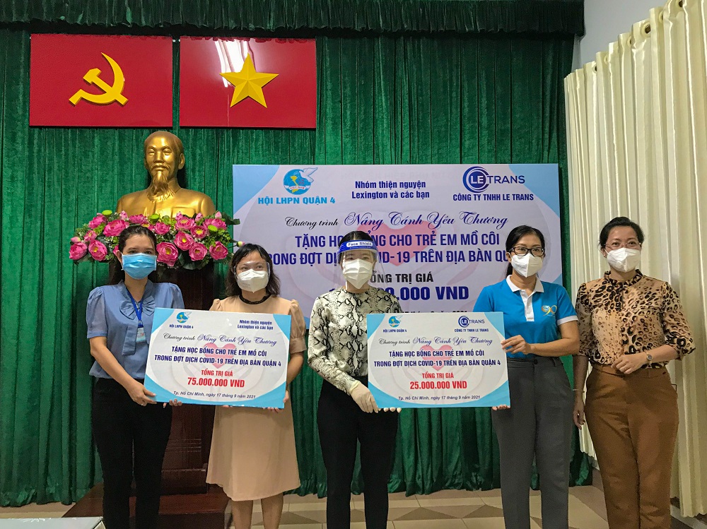 Thương cảm và bù đắp phần nào trước mất mát đau thương của các em, đồng thời tiếp tục giúp đỡ, tạo điều kiện cho các em tiếp tục đến trường vào năm học 2021 – 2022. Ngày 17/9, tại Trung tâm Bồi dưỡng Chính trị Quận 4 (TP.HCM), Hội Liên hiệp Phụ nữ Quận 4 phối hợp cùng Nhóm thiện nguyện Lexington và các bạn, tổ chức chương trình “Nâng cánh yêu thương” – trao tặng học bổng cho trẻ em mồ côi trong đợt dịch COVID-19. Khoảng 20 phần học bổng với tổng giá trị 100 triệu đồng sẽ được địa phương trao tận tay gia đình từng trẻ em bị ảnh hưởng bởi đợt dịch lần này.