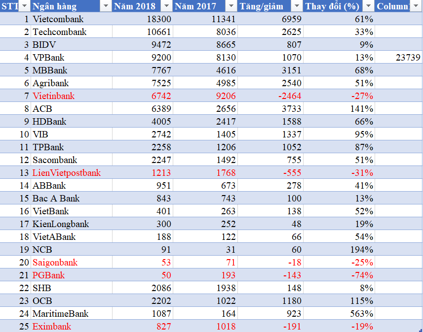 Nếu tính tổng lợi nhuận của 2 trong 3 ngân hàng (Vietinbank, BIDV và Agribank) vẫn chỉ trên dưới 16.000 tỷ đồng, chưa bằng con số lợi nhuận Vietcombank trong năm 2018 vừa qua.