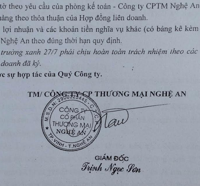 | Một văn bản của Công ty CP Thương mại Nghệ An gửi cho Công ty CP Đầu tư Môi trường Xanh 27/7 Nghệ An trong quá trình tranh chấp hợp đồng đã bị giả mạo chữ ký |