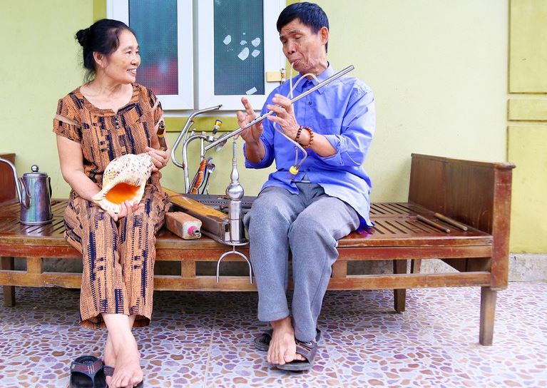 Không chỉ thế, ông Hoả còn chế những vật dụng quen thuộc như ấm nước, vỏ ốc, viên gạch,.. thành nhạc cụ.