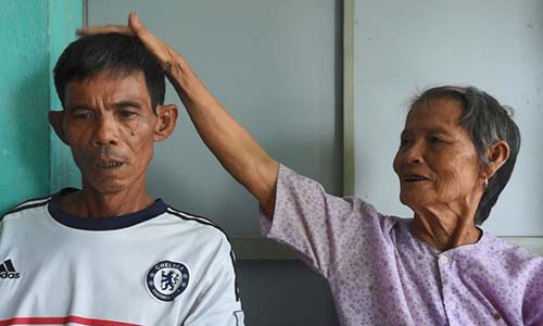 | Cụ Hậy bảo, cuối đời mà chứng kiến niềm vui chưa từng mơ tới. Bà xoa đầu con trai mới trở về như đứa trẻ. Ảnh: Lê Hoàng. |