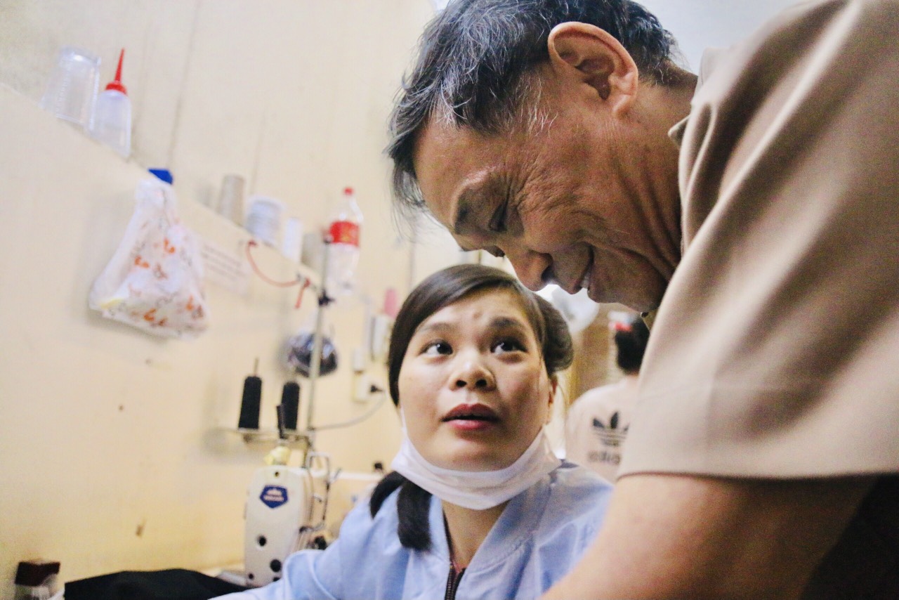 Ông Ngô Xuân Tự đến xưởng may thăm các học viên.