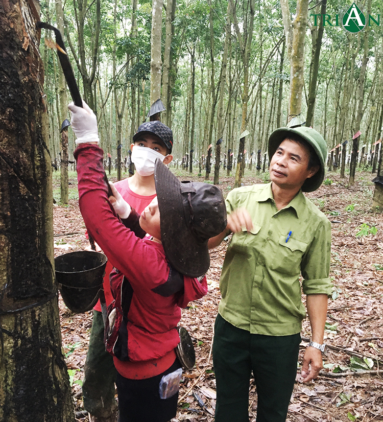Anh Vũ Mạnh Khải hướng dẫn người lao động thu hoạch mủ cao su.