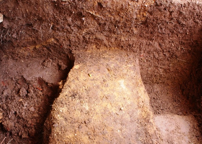Khi đào đến độ sâu khoảng 0,2 m, các nhà khảo cổ học phát hiện dấu vết gồm nhiều tảng đá nằm vuông góc với nhau. Riêng đoạn cuối lớp đá có một lớp vôi tiếp nối, cùng với lớp đất lạ giống như cát vàng và sỏi.