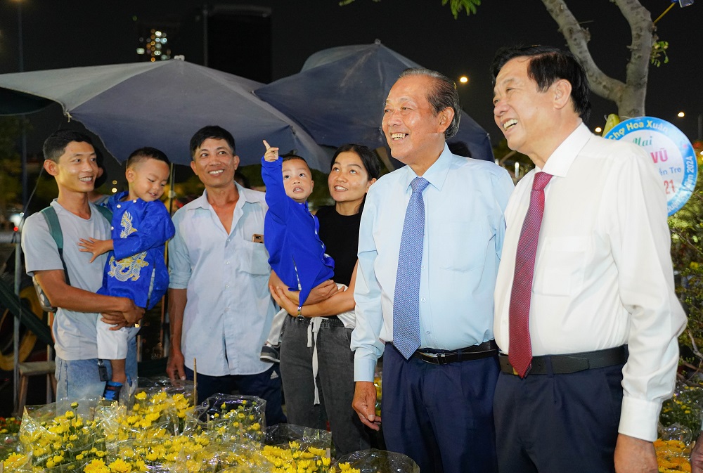 Nguyên Phó Thủ tướng Thường trực Chính phủ Trương Hòa Bình đến tận các gian hàng thăm hỏi, động viên các tiểu thương.
