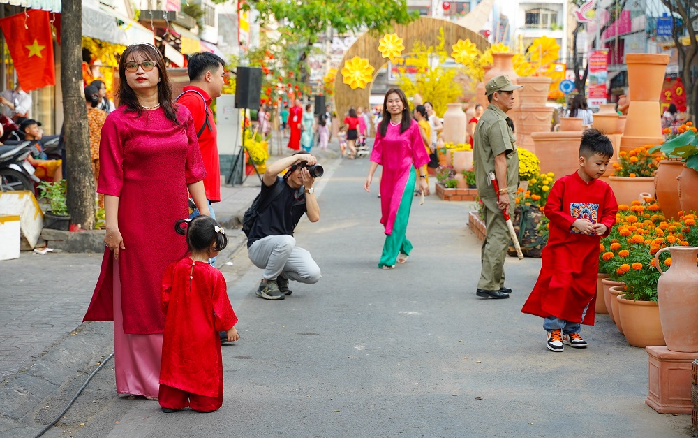 Ngoài việc tạo điều kiện mua bán hoa xuân, không gian các tuyến đường của chợ hoa còn là địa điểm tham quan, thưởng lãm đặc sắc cho người dân Thành phố và du khách gần xa. Dịp này nhiều em nhỏ cũng được bố mẹ, chuẩn bị quần áo Tết để cùng lưu lại những khoảnh khắc đẹp.