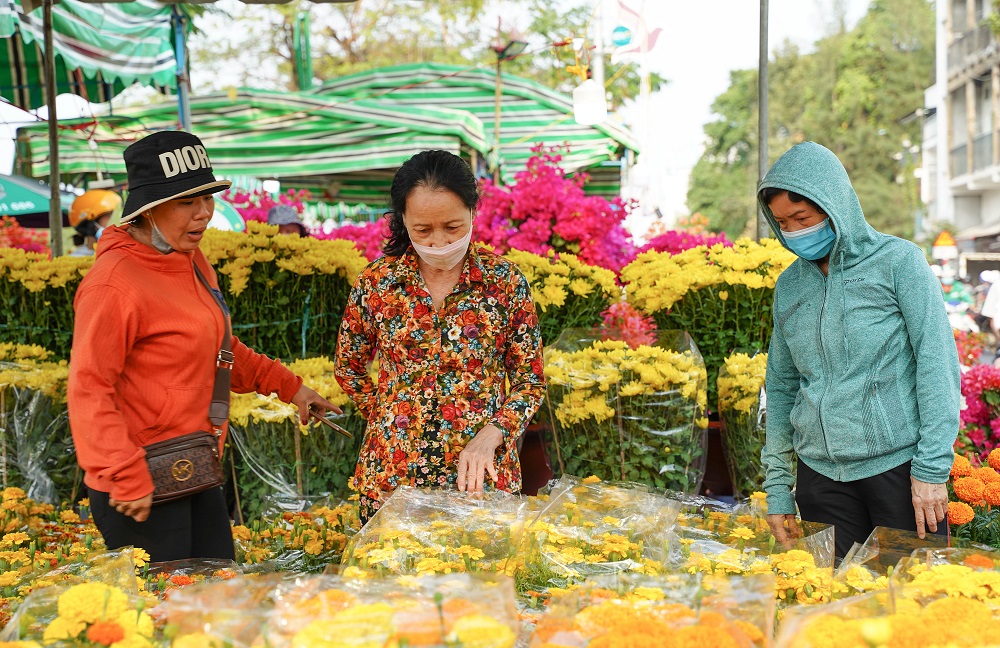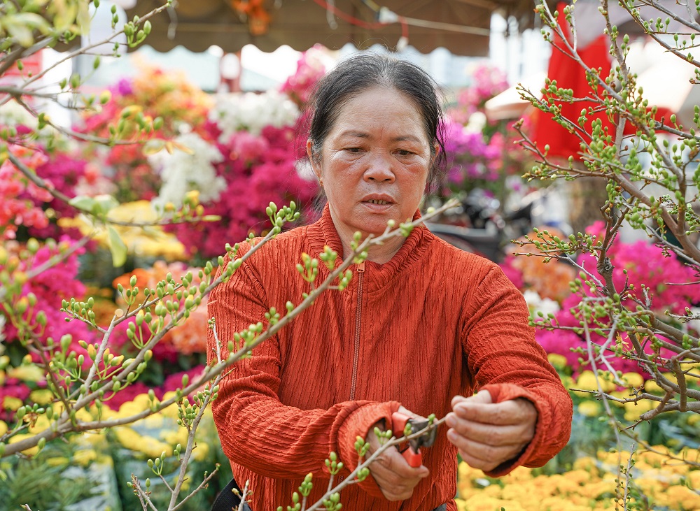Tiểu thương Huỳnh Thị Kiều cho biết: “Tôi và một số thành viên trong gia đình đem từ nhà dưới Vĩnh Long lên một số loại hoa như: hoa Mai, hoa Cúc, hoa Giấy, Cát Tường...".