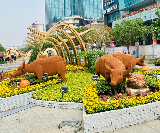Tại TPHCM, trước khi thực hiện dãn cách xã hội tại một số nơi có dịch COVID-19, một số tuyến đường như Lê Duẩn, Phạm Ngọc Thạch, Nguyễn Huệ (Quận 1); Huỳnh Tấn Phát, Nguyễn Văn Linh (Quận 7), những tiểu cảnh trang trí, linh vật trâu với nhiều màu sắc đã được trưng bày chào đón năm mới.