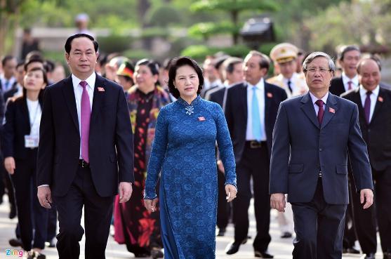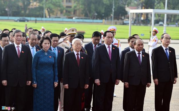 7h sáng 20/7, Tổng bí thư Nguyễn Phú Trọng, Chủ tịch nước Trần Đại Quang dẫn đầu đoàn đại biểu Quốc hội khóa XIV vào lăng viếng Chủ tịch Hồ Chí Minh trước kỳ họp đầu tiên.