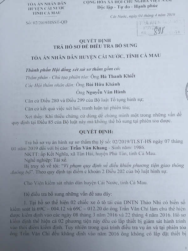 Tại phiên tòa, đại diện Viện KSND đề nghị Hội đồng xét xử cho rút hồ sơ để điều tra bổ sung, vì qua phần xét hỏi tại phiên tòa đã phát sinh tình tiết mới. Chính vì vậy, ngày 4/4/2019, TAND huyện Cái Nước có Quyết định số 02/2019/HSST-QĐ trả hồ sơ để điều tra bổ sung những vấn đề sau: