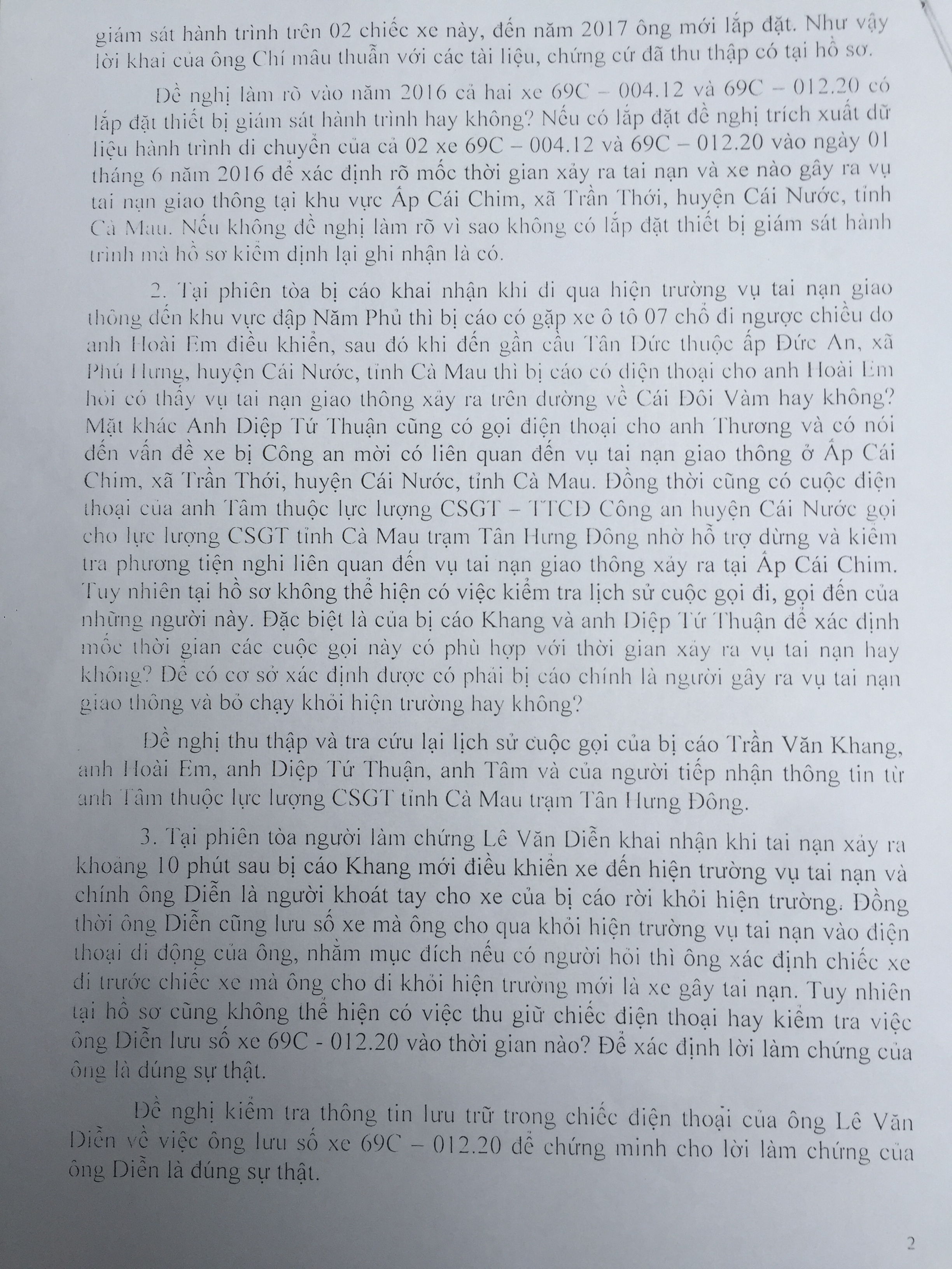 1.Đề nghị làm rõ vào năm 2016 xe 69C-004.12 và 69C-012.20co1 lắp đặt thiết bị giám sát hành trình hay không. Nêu có lắp đ8ạt đề nghị trích xuất dữ liệu hành trình di chuyển của của cả 2 xe vào ngày 1/6/2016 để xác định rõ mốc thời gian xảy ra tai nạn và xe nào gây ra vụ TNGT tại khu vực ấp Cái Chim, xã Trần Thới, huyện Cái Nước, tỉnh Cà Mau, vì sao không lắp đặt thiết bị hành trình mà hồ sơ kiểm định lại ghi nhận là có.