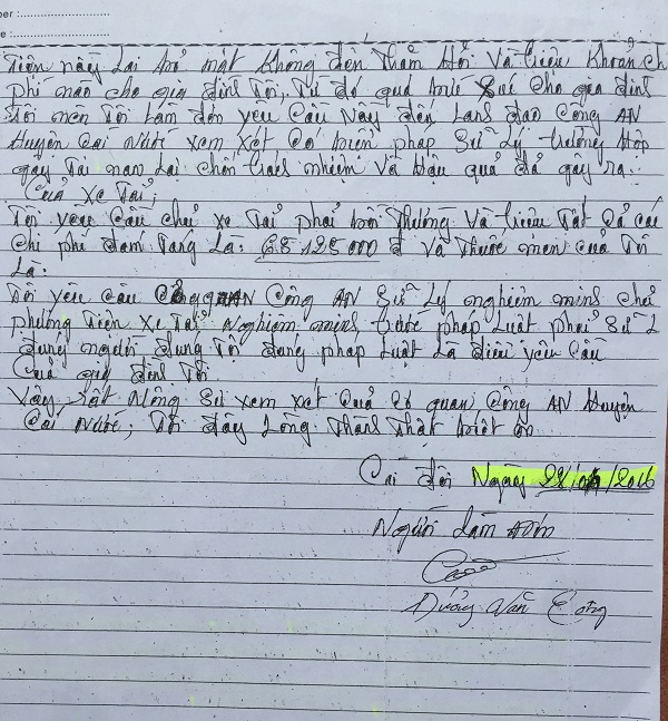 | Đơn của ông Dương Văn Công gửi Công an huyện Cái Nước. |