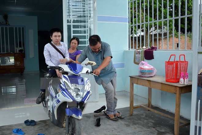 | Sinh hoạt hằng ngày của Trung đều phải nhờ vào bố. (Ảnh: Hồng Điệp/TTXVN) |