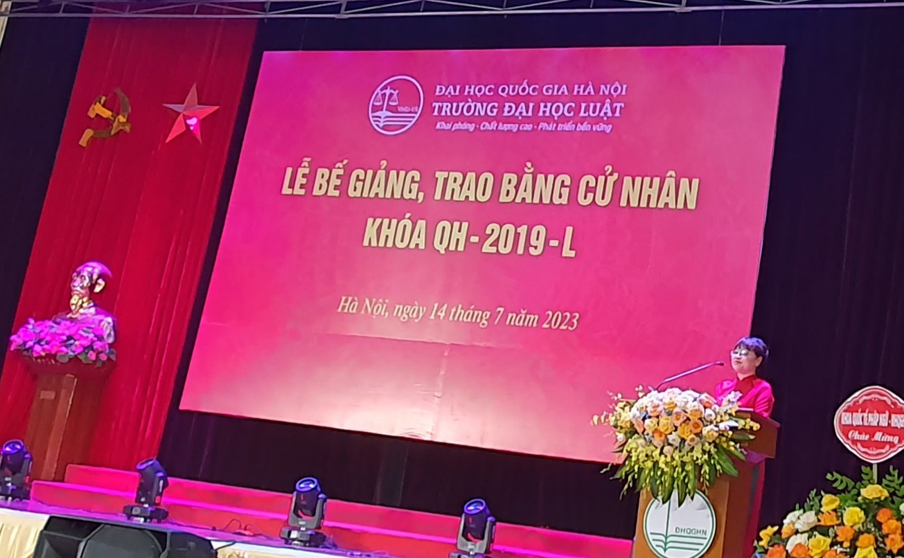 Phát biểu tại Lễ trao bằng, PGS.TS Nguyễn Thị Quế Anh - Hiệu trưởng Nhà trường cho biết: Đây là khóa đầu tiên có sinh viên Luật thương mại quốc tế tốt nghiệp. Trong nhiều năm qua, nhà trường là cơ sở đào tạo khoa học pháp lý có chương trình đạo tạo 3 bậc: Cử nhân, Thạc sĩ, Tiến sĩ. Các học viên của nhà trường được các cơ sở tuyển dụng đánh giá cao về chất lượng đào tạo.
