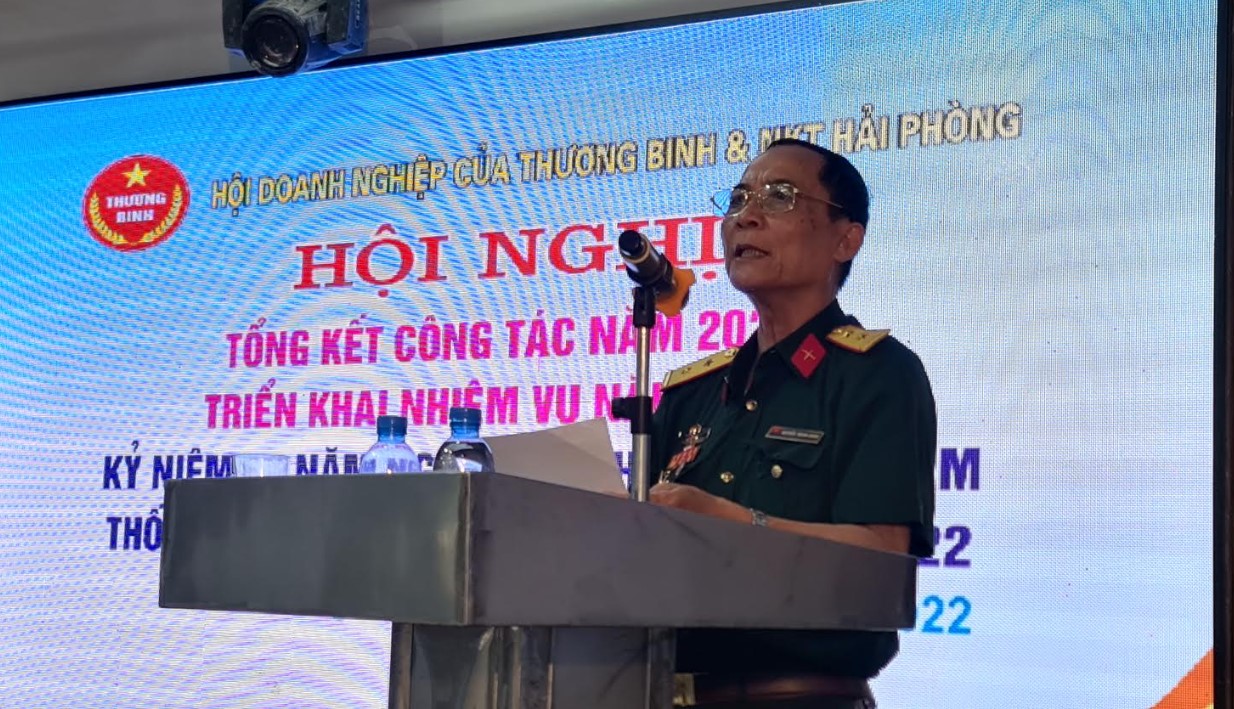 Đồng chí Phạm Văn Tố - Phó Chủ tịch, thường trực hội báo cáo tổng kết hoạt động của hội Doanh nghiệp Thương binh và NKT Hải Phòng và đưa ra phương hướng nhiệm vụ năm 2022. Phát huy những kết quả đã đạt được, khắc phục những tồn tại, hạn chế trong năm 2021, tiếp thu những ý kiến đóng góp của thành phố. Theo đó, Hội tập trung củng cố, nâng cao cách thức tuyên truyền của cán bộ đến từng cơ sở, nghiêm chỉnh chấp hành tốt các qui chế nội qui của Hội và chính sách pháp luật của nhà nước, các chỉ thị, nghị quyết của Quốc hội. Tích cực tham gia các phong trào thi đua của tổ chức và các phong trào thi đua của Doanh nghiệp và cơ sở địa phương. Đồng thời làm tốt công tác tuyên truyền, vận động phát triển hội viên và nhân dân tích cực tham gia xây dựng hội ngày thêm vững mạnh. Các cán bộ hội viên được quán triệt, học tập các chỉ thị, nghị quyết của Đảng, chính sách pháp luật của nhà nước; 100% cán bộ, hội viên kiên định vững vàng về chính trị tư tưởng, không có “Tự diễn biến”, “Tự chuyển hoá” từ nội bộ, không ỉ lại công thần địa vị. Các thành viên chấp hành và vận động gia đình thực hiện phòng chống Covid 19, hỗ trợ lẫn nhau để sản xuất kinh doanh và tạo việc làm ổn định đạt 100% so với ban đầu và tăng thu nhập cho người lao động. Theo đó, 100% hội viên hoàn thành tốt nhiệm vụ; trong đó 20% hoàn thành xuất sắc; 98% Hội viên đạt hội viên gương mẫu; gia đình văn hóa.