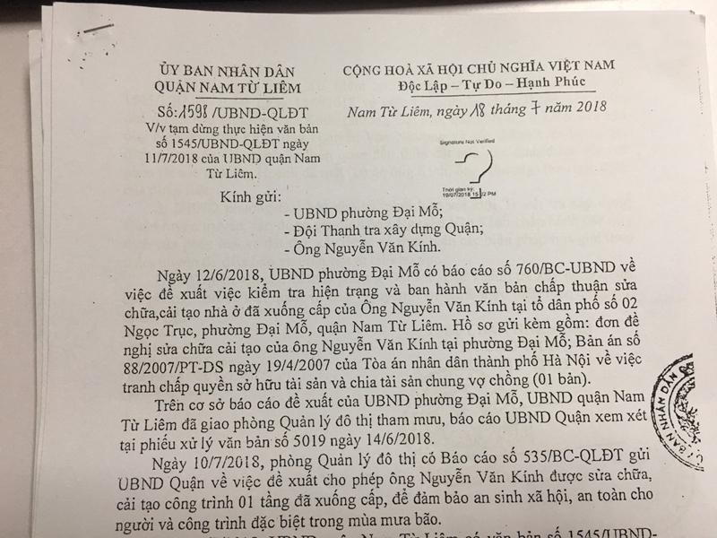 Ngày 11/7/2018, UBND quận Nam Từ Liêm có văn bản số 1545/UBND-QLĐT về việc chấp thuận cho cải tạo, sửa chữa nhà ở của ông Nguyễn Văn Kính, phường Đại Mỗ, quận Nam Từ Liêm... Văn bản 1545 ban hành chưa được bao lâu, chữ ký chưa ráo mực thì lại ra tiếp văn bản số 1598 để tạm dừng thực hiện!!!