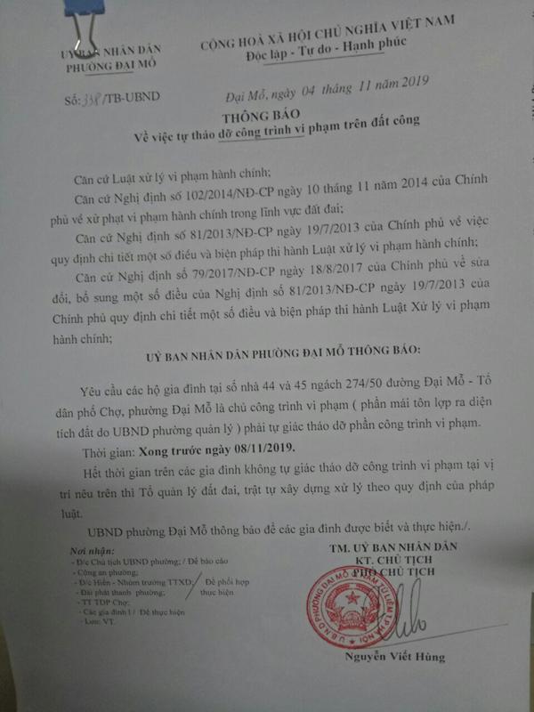 Cụ thể là công trình lấn chiến đất công thi công ngày 28/10/2019, ngày 04/11/2019, UBND phường Đại Mỗ đã ra Thông báo số 338/TB-UBND về việc tự tháo dỡ công trình vi phạm đất công của hộ gia đình số nhà 44 và 45, ngách 274/50, đường Đại Mỗ, TDP Chợ tự tháo dỡ công trình vi phạm trước ngày 08/11/2019. Tuy nhiên đến nay công trình vi phạm vẫn còn tồn tại.