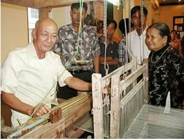 Nghệ nhân Triệu Văn Mão bên khung cửi của mình