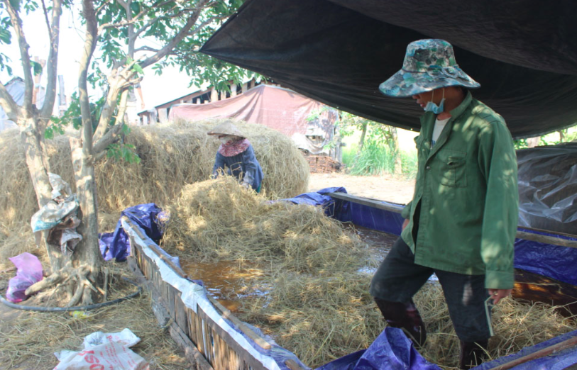 việc kéo rơm chất đống quanh nhà chuẩn bị trồng nấm. Trước đó, anh từng thành