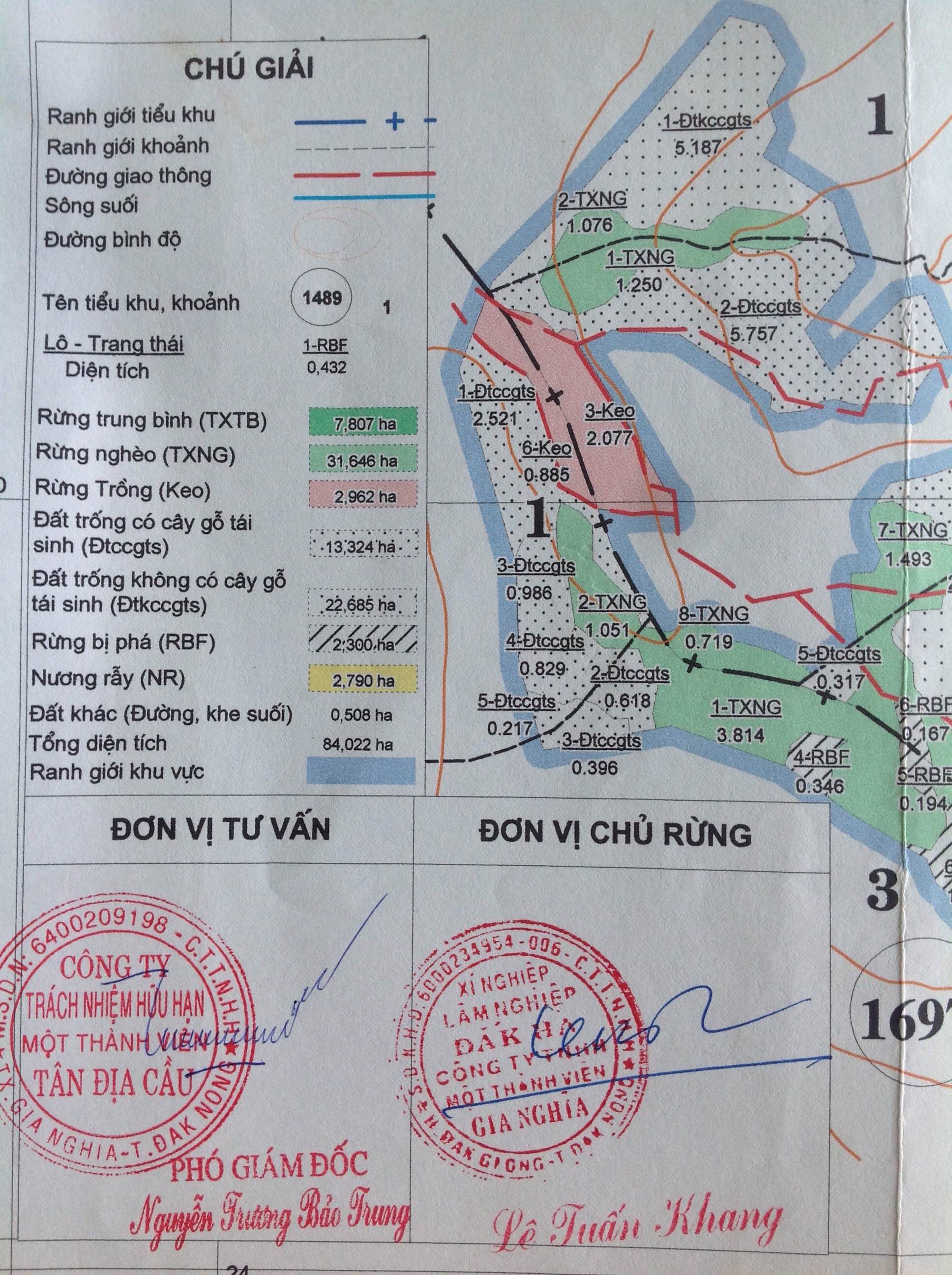 Tại lô 3, khoảnh 1-TK 1697, ngày 30/6/2014 Công ty TNHH MTV Tân Địa Cầu và Xí nghiệp Lâm nghiệp Đăk Ha ký xác nhận vào “Bản đồ xác minh hiện trạng rừng” là “Đất trống có cây gỗ tái sinh” (không còn rừng)