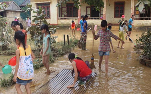 | Giáo viên học sinh vùng lũ Quảng Bình hối hả dọn trường sau lũ. |
