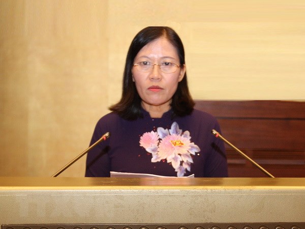 | Chủ nhiệm Uỷ ban Tư pháp của Quốc hội Lê Thị Nga trình bày Báo cáo thẩm tra dự án Luật Phòng, chống tham nhũng (sửa đổi). (Ảnh: Nguyễn Dân/TTXVN) |