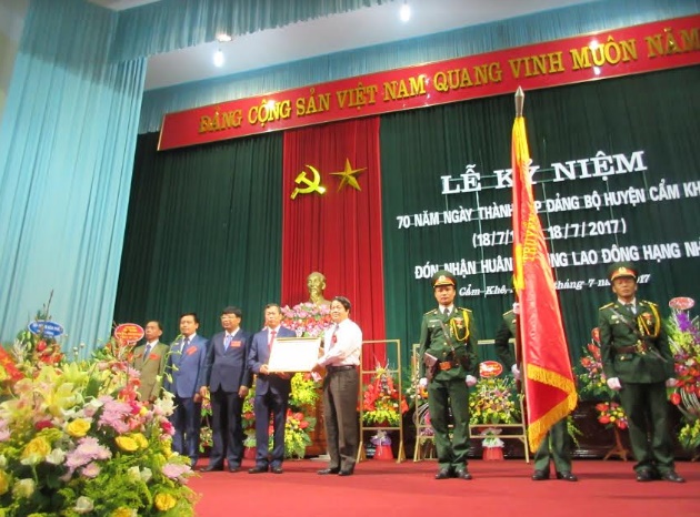 | Thừa ủy quyền của Chủ tịch nước, đồng chí Hoàng Dân Mạc - Bí thư Tỉnh ủy, Chủ tịch HĐND tỉnh trao tặng Huân chương lao động hạng Nhì cho Đảng bộ huyện Cẩm Khê. |
