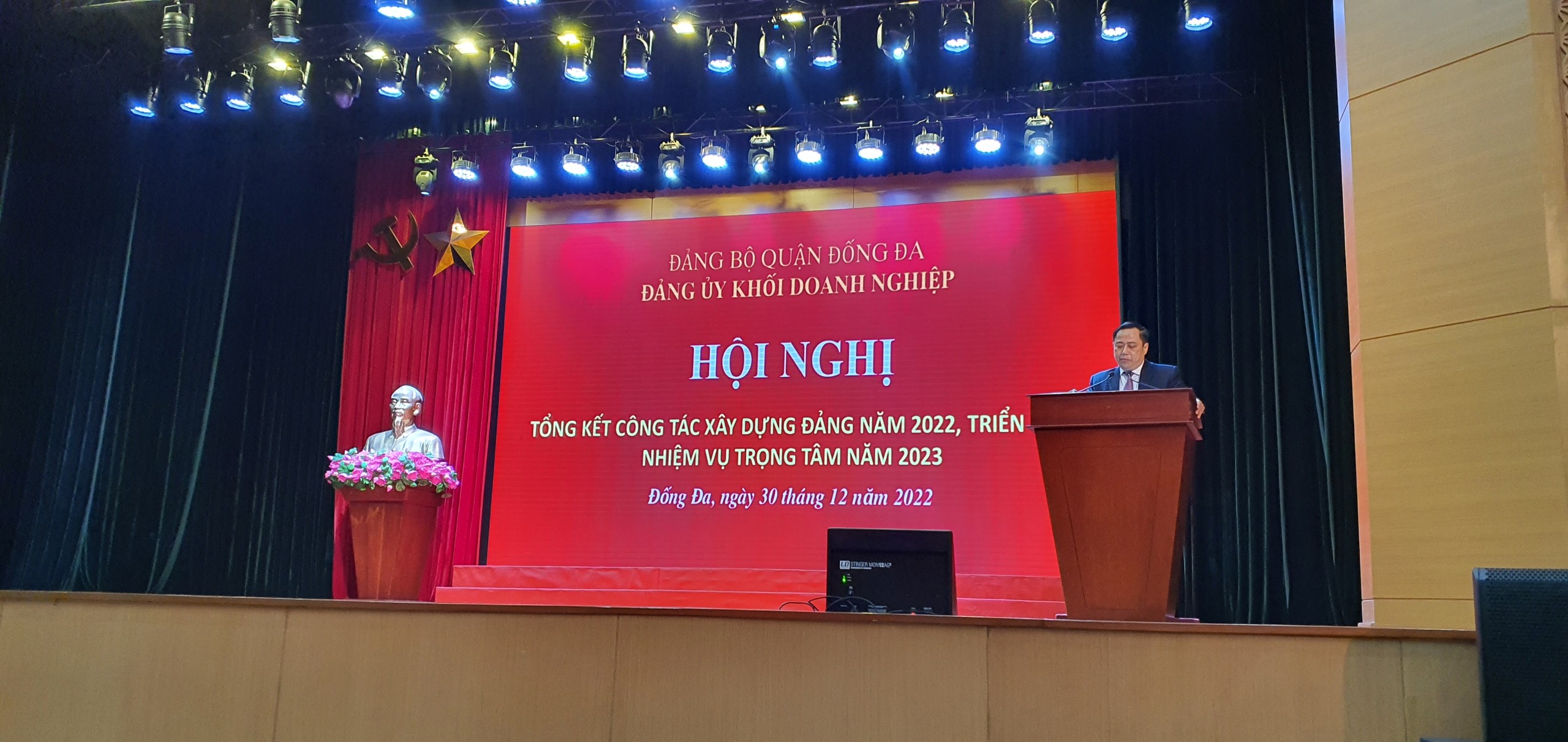 Đồng chí Nguyễn Văn Quang, Phó Bí thư, Chủ nhiệm ủy ban kiểm tra Đảng bộ Khối doanh nghiệp quận Đống Đa trình bày báo cáo tổng kết công tác xây dựng Đảng năm 2022; triển khai nhiệm vụ trọng tâm năm 2023. Trong năm qua, với tinh thần chủ động, quyết tâm cao, trên cơ sở bám sát sự chỉ đạo của Quận ủy, các kế hoạch công tác của quận, chương trình công tác năm 2022 và tình hình thực tiễn của Đảng bộ Khối; tập thể Đảng bộ Khối và Ban Thường vụ đã tập trung lãnh đạo, chỉ đạo các tổ chức đảng trực thuộc triển khai thực hiện tốt nhiệm vụ năm 2022...