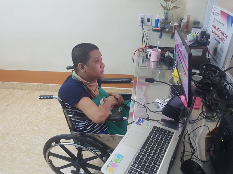 Đặng Minh Tuấn làm việc với đôi bàn tay bị liệt, di chuyển chuột bằng một ngón tay. (Ảnh: Nguồn Donghanhviet.vn)