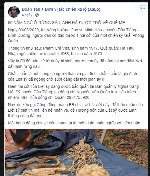 Cụ thể, thông tin lan truyền nêu: "Ngày 03/08/2020, tại Nông trường Cao su Minh Hòa - huyện Dầu Tiếng - Bình Dương, người dân có đào được 1 hài cốt của một chiến sỹ Giải Phóng Quân. Thông tin như sau: Phạm Chí Việt, sinh năm 1947, Quê quán: Hà Tây. Nhập ngũ chiến trường năm 1968, hi sinh năm 1970. Hiện hài cốt của Liệt sĩ đang được bảo quản tại Ban quản lý Nghĩa trang Liệt Sĩ huyện Dầu Tiếng, do đồng chí Nguyễn Văn Quân trực tiếp trách nhiệm. SĐT của đồng chí Quân: 0931755920.