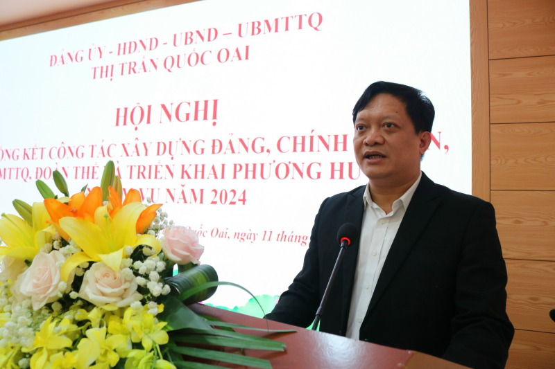 Đồng chí Nguyễn Đình Đức - Huyện uỷ viên, Bí thư Đảng uỷ, Chủ tịch HĐND thị trấn Quốc Oai phát biểu chỉ đạo tại Hội nghị tổng kết công tác xây dựng Đảng, chính quyền, MTTQ, đoàn thể năm 2023 và triển khai nhiệm vụ năm 2024.